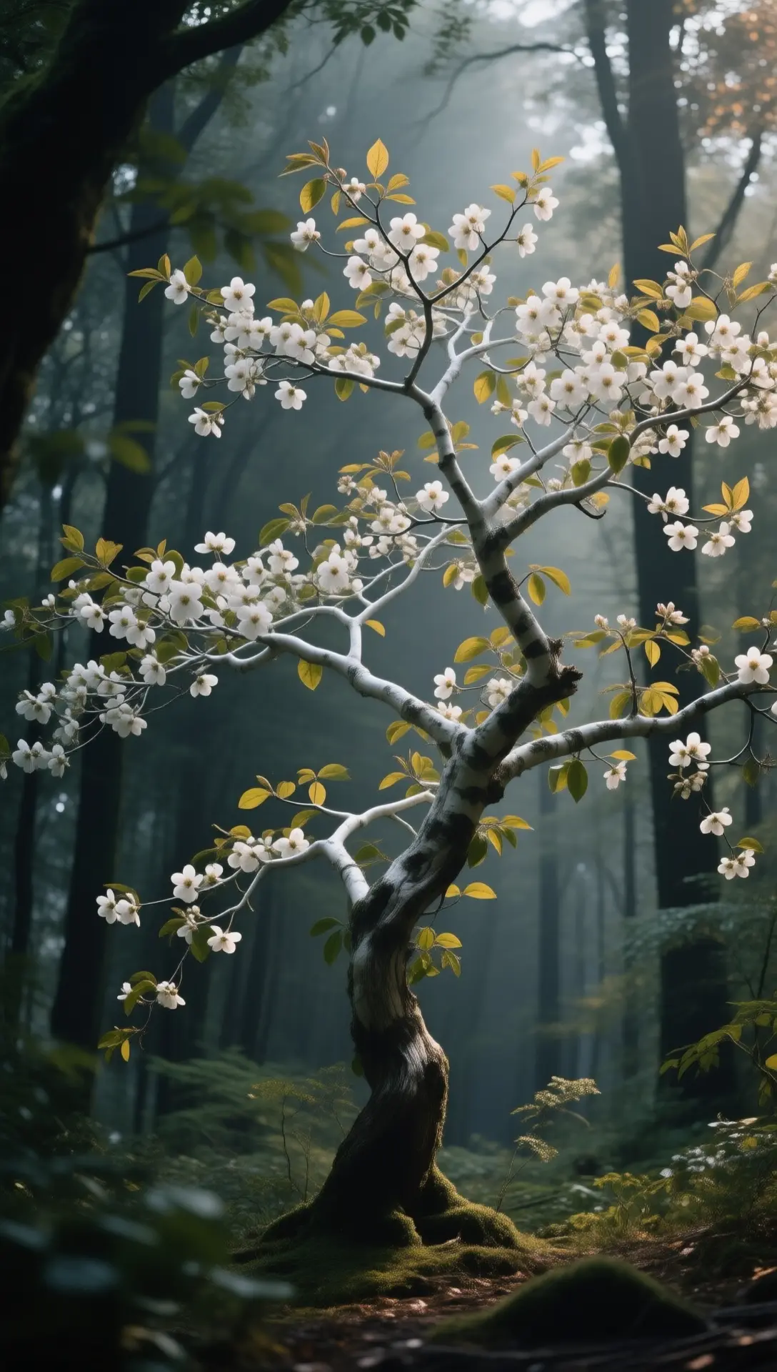 یک والپیپر زیبا از یک درخت زغال اختهی باشکوه با شکوفههای سفید ظریف که به تنهایی در جنگلی عمیق، مهآلود و اتمسفریک ایستاده است.