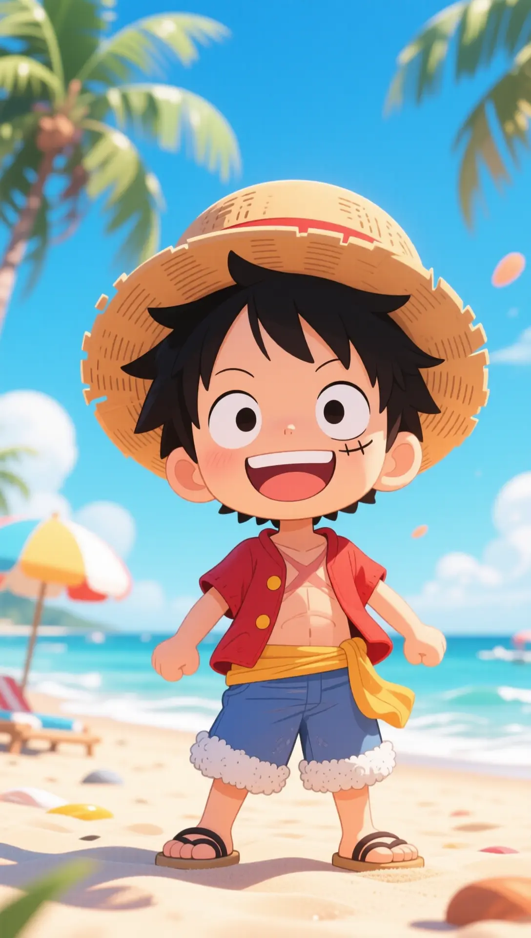 یک والپیپر چیبی دوستداشتنی از مانکی دی. لوفی شاد که از یک روز عالی در ساحل لذت میبرد، با درختان نخل و آسمان آبی روشن.