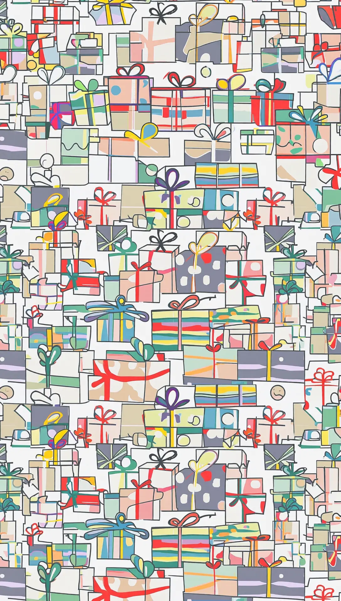 یک والپیپر شاد و پرجنب و جوش با پترنی یکپارچه از جعبههای هدیه رنگارنگ و استایلایز شده با خطوط مشکی در پسزمینهای سفید.