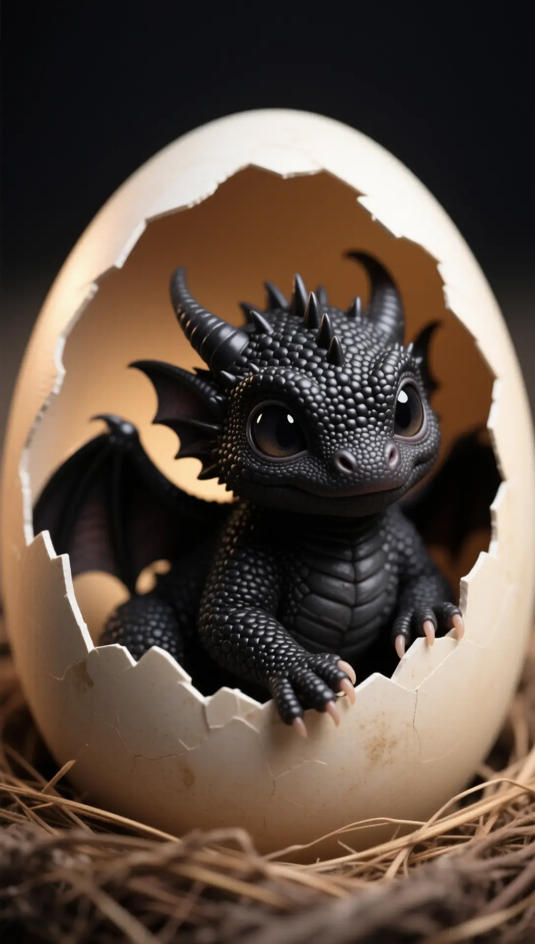 یک والپیپر دوستداشتنی از یک بچه اژدهای کوچک سیاه با چشمان درشت که به تازگی از تخم خود در یک لانه دنج بیرون آمده است.