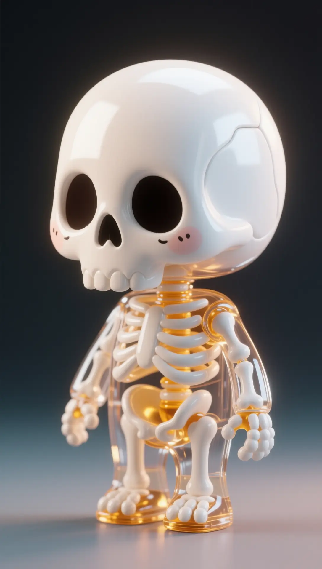 یک والپیپر منحصر به فرد از یک مجسمه اسکلت بامزه و استایلایز شده با جمجمهای بزرگ و بدنی شفاف که استخوانهای سفید و طلایی درون آن را نمایان میکند.