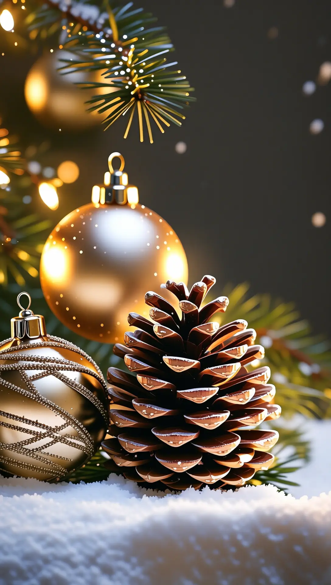 یک نمای نزدیک جشن از گویهای طلایی کریسمس و یک میوه کاج که در برف قرار گرفتهاند، با یک درخت کریسمس زیبا و نورانی در پسزمینه.