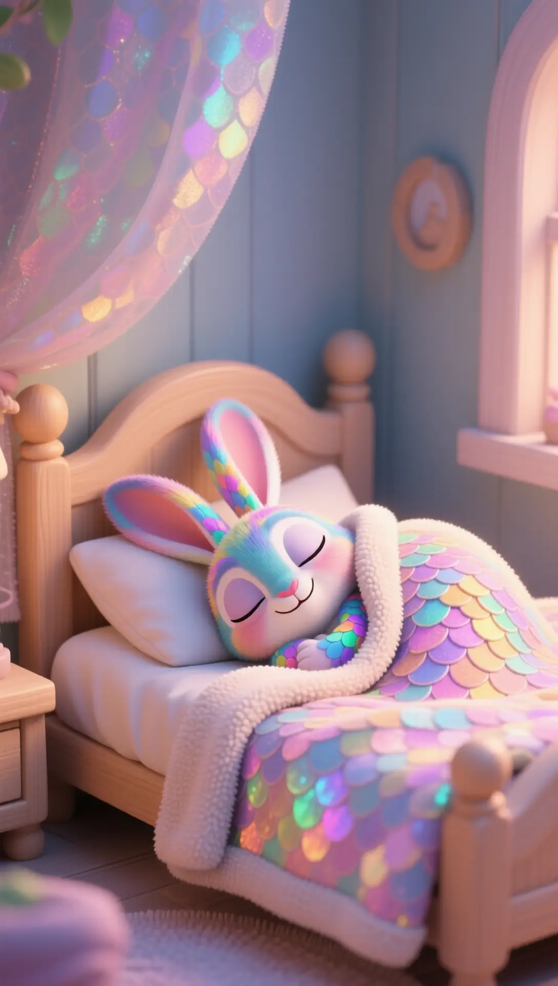یک والپیپر دوستداشتنی از یک خرگوش رنگینکمانی که با آرامش در یک تخت چوبی خوابیده است. بدن خرگوش و پتوی گرم و نرم آن با پولکهای زیبای رنگینکمانی شبیه به پری دریایی پوشیده شده که فضایی جادویی و رویایی ایجاد میکند.