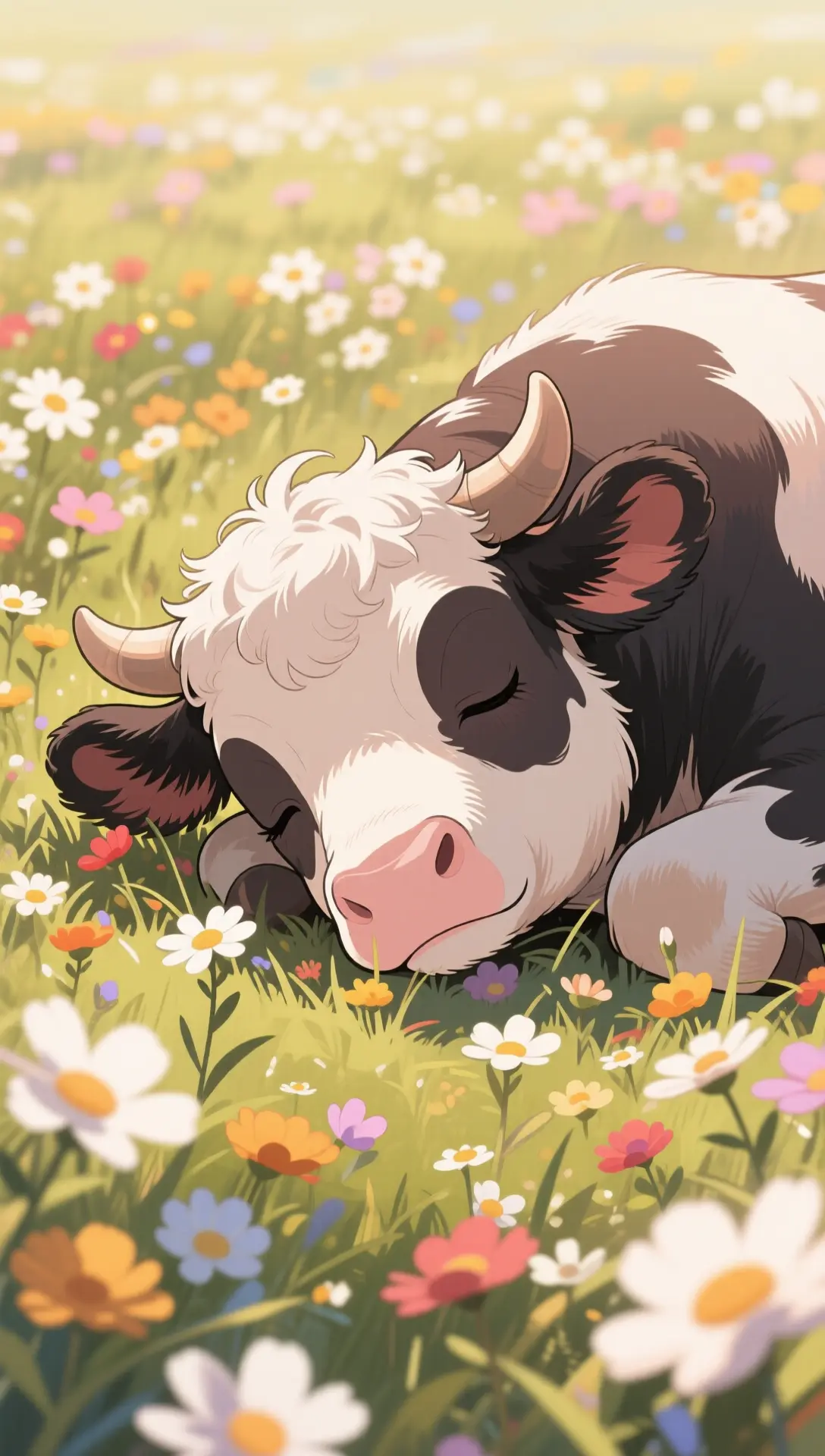 یک والپیپر آرامشبخش به سبک انیمه از یک گاو خوشحال که با آرامش در چمنزاری زیبا و پر از گلهای وحشی رنگارنگ خوابیده است.