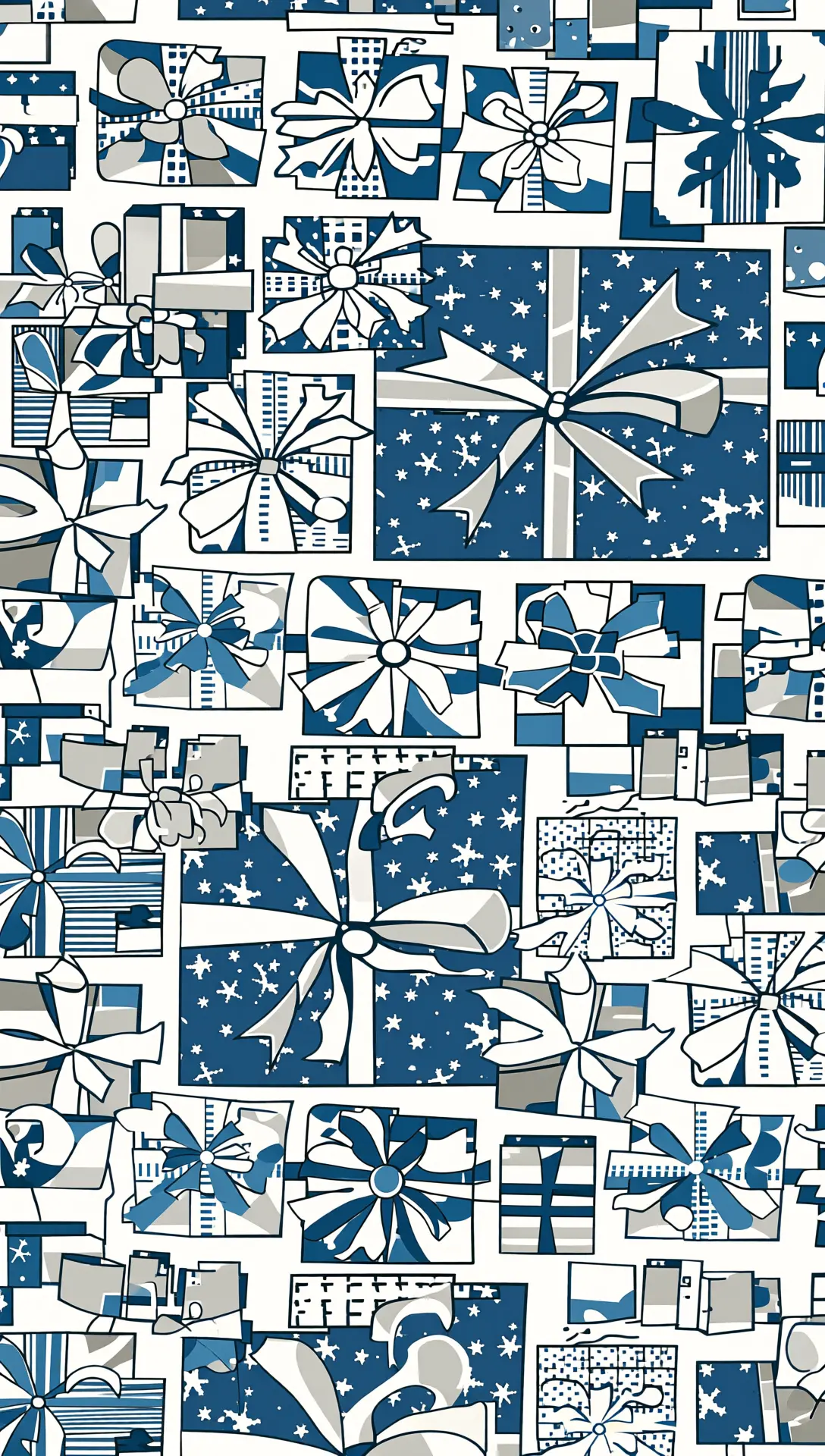 یک والپیپر شیک و مدرن با پترنی متراکم و استایلایز شده از هدیههای کریسمس در پالت رنگی سرد آبی، خاکستری و سفید.